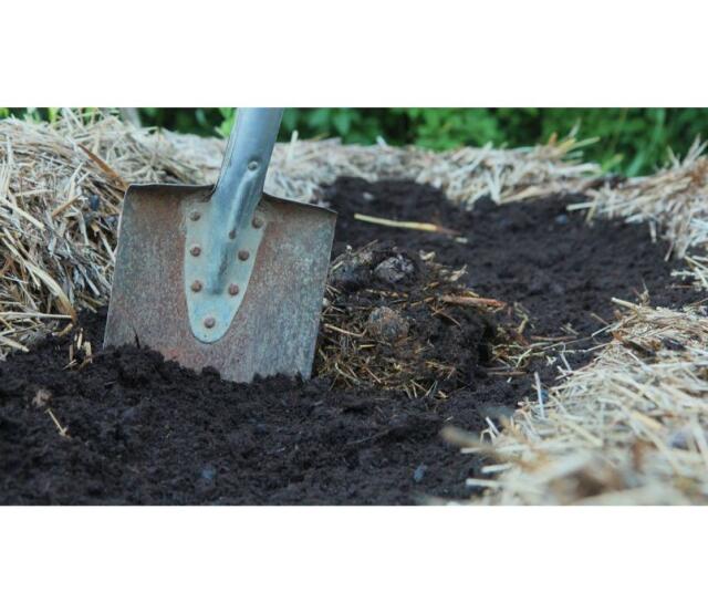 2. Därefter vänder du ner gödseln i jorden med en grep så att allt blandas ordentligt. Passa samtidigt på att rensa bort eventuellt ogräs som har blivit kvar sedan hösten.