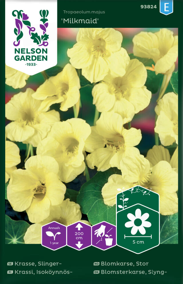 Frö till slingerkrasse finns även i flera härliga mixpåsar. ’Out of Africa’ blommar i gula, orange och röda nyanser och är särskilt praktfull med sitt grönvita bladverk. Glorious Gleam har fyllda blommor i starka färger och ett helgrönt bladverk.