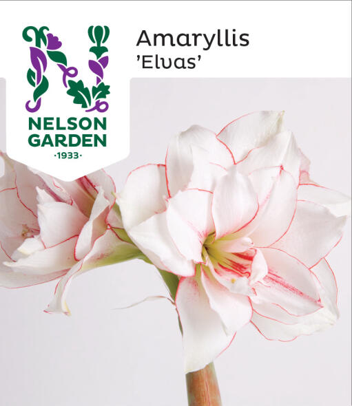 Elvas är en amaryllis vars blommor kommer att slå dig med häpnad. De är stora, dubbla och färgade i vitt med mustigt körsbärsröda flammor och kanter. Utan större svårigheter kan även du låta denna skönhet sprida odlarglädje i ditt hem.