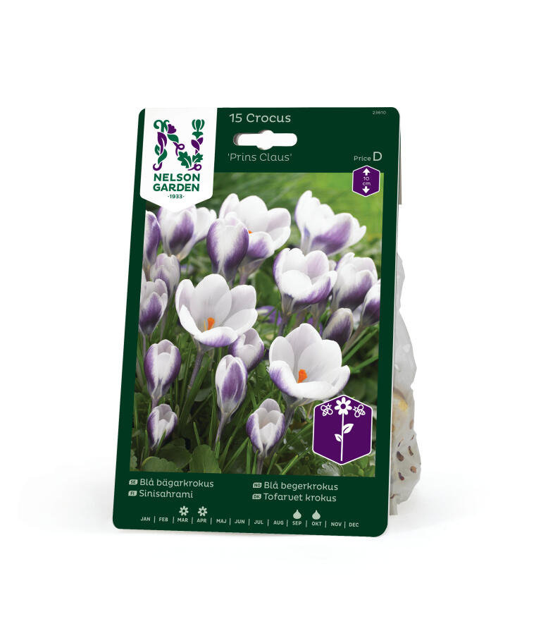 'Prins Claus' är en sort av blå bägarkrokus, som har vita blommor där de yttre blombladen har blåvioletta fläckar. Passar fint förutom i rabatten, i kanten av buskar och framför träd där vårsolen lyser. Vacker planterad i grupper i glest gräs.