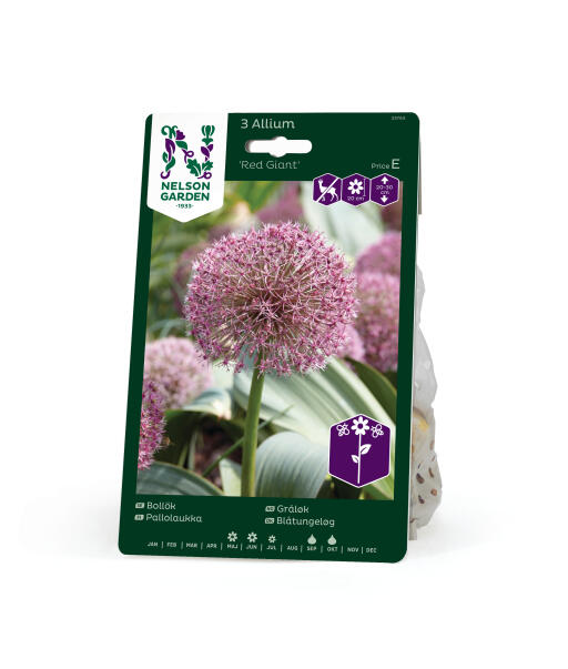 En liten jätte! Liten för den nätta höjden, jätte för den stora rödlila blomman, som kan bli upp till 20 cm. Bladen är breda och vackert gråskimrande. Magnifik allium för kruka. Anses vara mindre smaklig för rådjur, hare, kanin och sork.