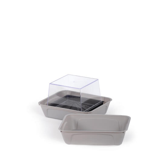 Ett tätt tråg som passar som bottentråg till groddboxen. Skyddar underlaget från att bli blött. Diskret grå färg. Av polypropen (PP). Kan maskindiskas i max 40°C.
