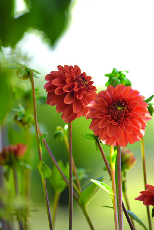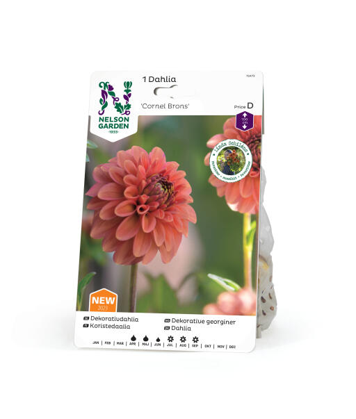 Hög aprikosfärgad pompomdahlia med mörka stjälkar som är underbar till snitt. En sommarens läckerhet i rabatt och bukett.