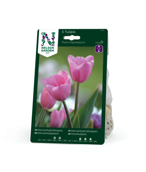 Låt dig imponeras! Denna darwinhybrid i flera nyanser av rosa är i sin enkelhet oerhört vacker. Plantera gärna ihop med små pärlhyacinter eller ljuva förgätmigej.
