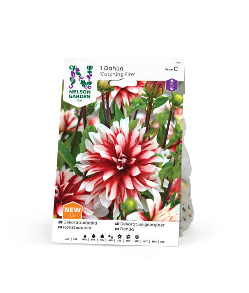 En dekorativdahlia som ser ut att brinna med en inre glöd. Den eldröda färgen sprider sig ut över vita och lätt bakåtstrukna kronblad. Ett sprakande inslag i rabatten men även en hållbar dekoration i vas.