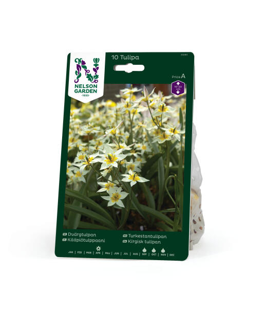 Dvärgtulpanen blommar rikligt och får ofta flera små blommor på varje stängel. Blommorna, som öppnar sig till en vid stjärna, är vita på insidan med gult centrum. Utsidan av blombladen är svagt gråvioletta med gul bas.