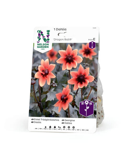 Vackra orange blommor i mjuka toner mot bladverk i mörkaste grönt - denna låga dahlia är en kontrasterande skönhet som smyckar varje rabatt och varje kruka.