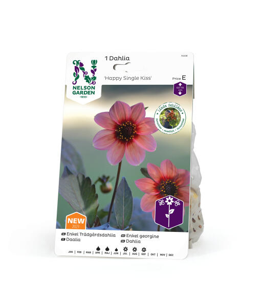 Trollbindande, nästintill hypnotisk enkelblommig dahlia med en mörk mitt och stora aprikosrosa kronblad. Blomman kan bli ca 9 cm och är vacker i såväl kruka som rabatt.