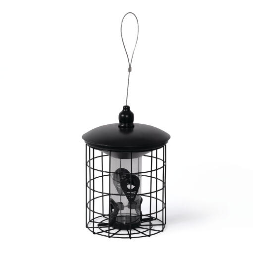 Fågelmatare för frö med skyddande galler som utestänger större fåglar. Fylls på via fodermagasin i locket där mycket fågelmat ryms. Med vajer och karbinhake. Svart metall H 29 cm Ø 20 cm