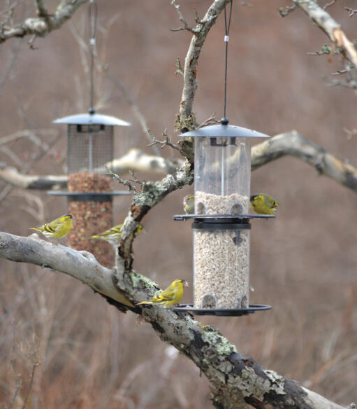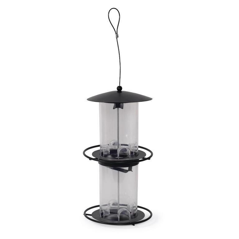 Traditionell fågelmatare för fågelfrö med 8 foderuttag och 2 sittringar. Behållare i polystyren, övriga delar av svart metall. Vajer och karbinhake medföljer. H 35 cm Ø 18 cm.