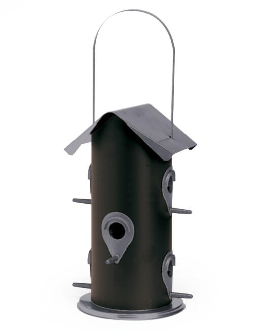 Stor fågelmatare för fågelfrö. Tak och botten i grå, behållare i svart metall. 6 foderuttag med sittpinne i grå plastöverdragen metall. Fylls på uppifrån. Rymmer ca 3 liter. H 32 cm Ø 16 cm