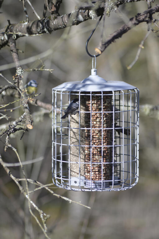 Stor fågelmatare med skyddande galler som utestänger större fåglar. Tre behållare, en för fågelfrö, en för nötter och en för talgbollar (90 g). Varje behållare rymmer ca 1 liter (3 x 1 liter). Av plast och metall. Grå. H 34 cm Ø 24 cm