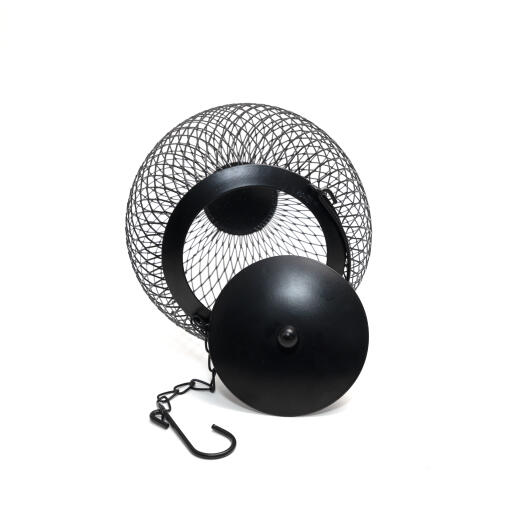 Fågelmatare för nötter i svart metall. Dekorativt rund form. Försedd med lock, bygel och kedja med krok. H 25 cm Ø 15 cm.