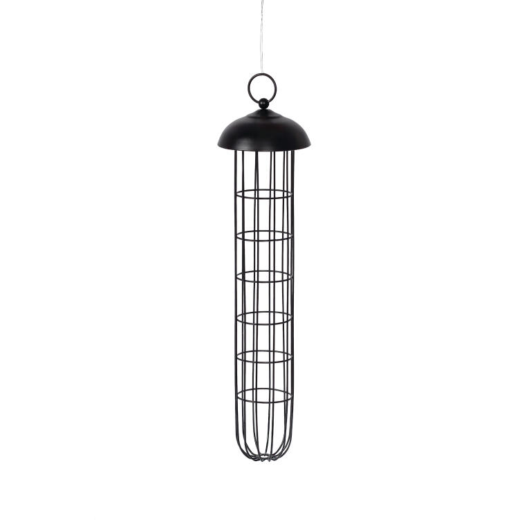 Funktionell fågelmatare med plats för 7 st. 90 g talgbollar. Enkel att fylla på och rengöra. Här får många småfåglar plats att äta samtidigt. Svart metall H 45 cm, Ø 10 cm