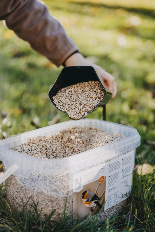 Foderskopa med smart öppna-/stängfunktion som underlättar påfyllning av fågelmat. Passar även i fågelmatare med liten öppning. Polypropen (PP), svart, ca 30 cm lång.