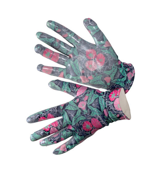 Smidig handske med perfekt passform och utmärkt fingertoppskänsla. Sömlös stickad polyester med transparent nitrildoppning i retromönster designat av Gunnel Ginsburg. Åkervinda.