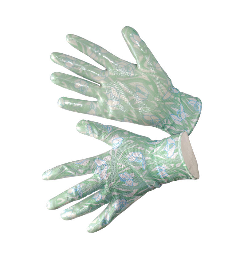 Smidig handske med perfekt passform och utmärkt fingertoppskänsla. Sömlös stickad polyester med transparent nitrildoppning i retromönster designat av Gunnel Ginsburg. Snödroppe. Grön.