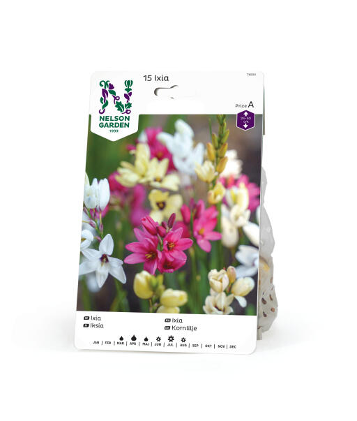 Ixia, eller afrikansk harlekinblomma, finns i många pigga färger. De skira, klockformade blommorna sitter på långa stjälkar och gör den till en fin snittblomma. Den nätta höjden är perfekt för rabattkanten eller krukan på balkongen.
