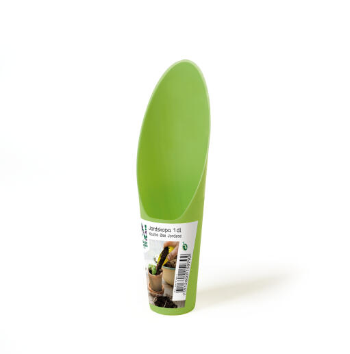 Litet och praktiskt hjälpmedel vid förodling och omplantering när små krukor ska fyllas med jord. Jorden hamnar där den ska och kan även plattas till runt plantan med skopans botten.