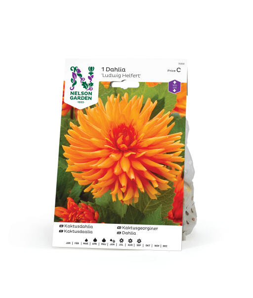 Hög och reslig kaktusdahlia med välfyllda orangefärgade blommor med stor attraktionskraft. Planteras med fördel i den bakre delen av rabatten, alternativt i en stor kruka på altanen.