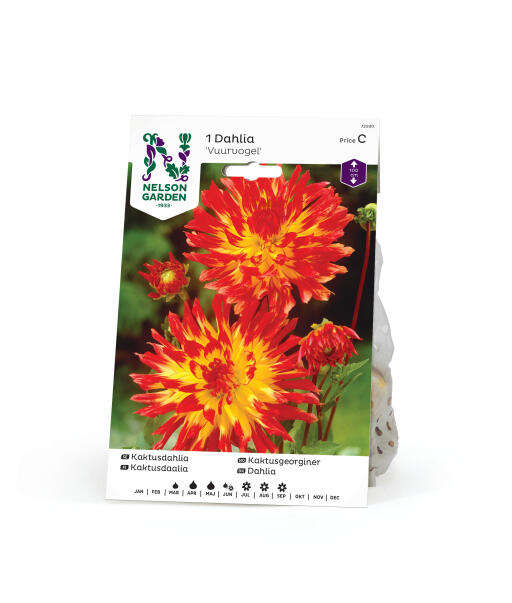 Uppseendeväckande och färgsprakande kaktusdahlia med eldigt orangeröda blommor hela sommaren. Pryder sannerligen sin plats i rabatt eller kruka. Mycket fin till snitt. Kan behöva uppbindning.