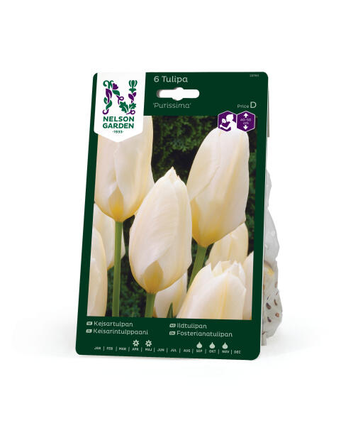 'Purissima' har stora avlånga blommor som är vackert sidenglänsande i vitt och doftar ljuvligt. Sorten tillhör Fosteriana-gruppen och kan bli långlivad i trädgården.