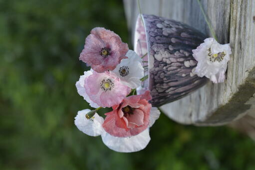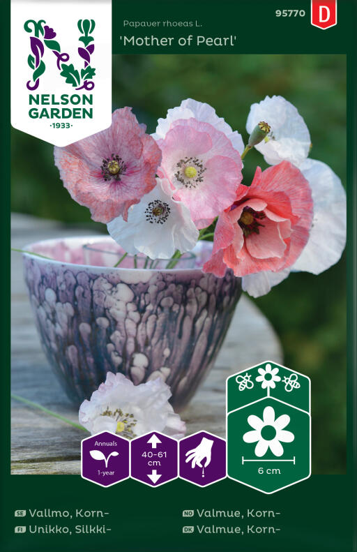 Vallmo med silkestunna kronblad som lyser upp både rabatt och ängsplantering med sina vita och blekt rosa blommor. Frökapslarna är dekorativa att torka och använda i eternellbuketter. Det är en anspråkslös sommarblomma som gärna frösår sig.