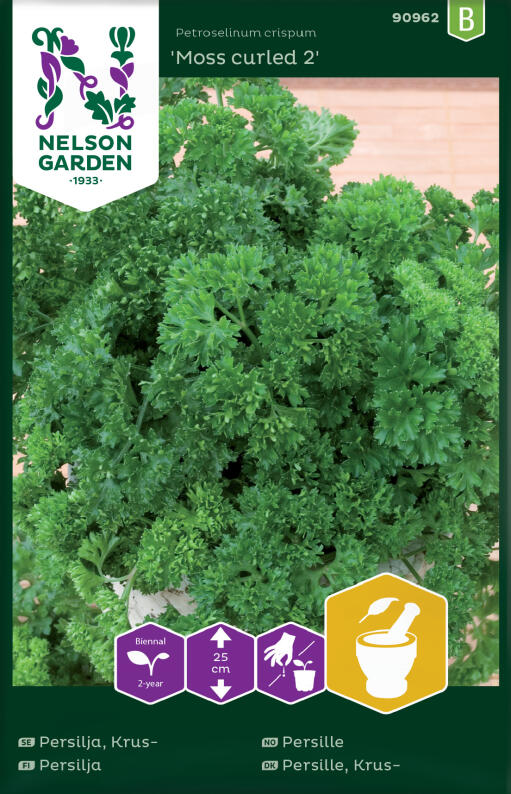 Persilja med mosskrusiga blad. Groningstid 2-4 veckor. Skördas efter hand, långt in på hösten. Går bra att frysa in.