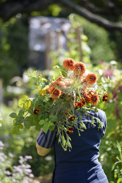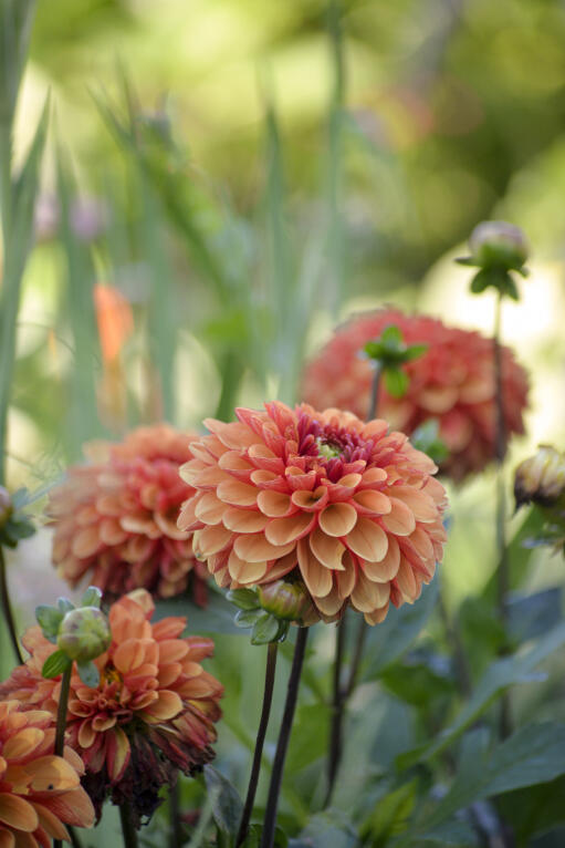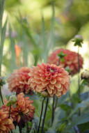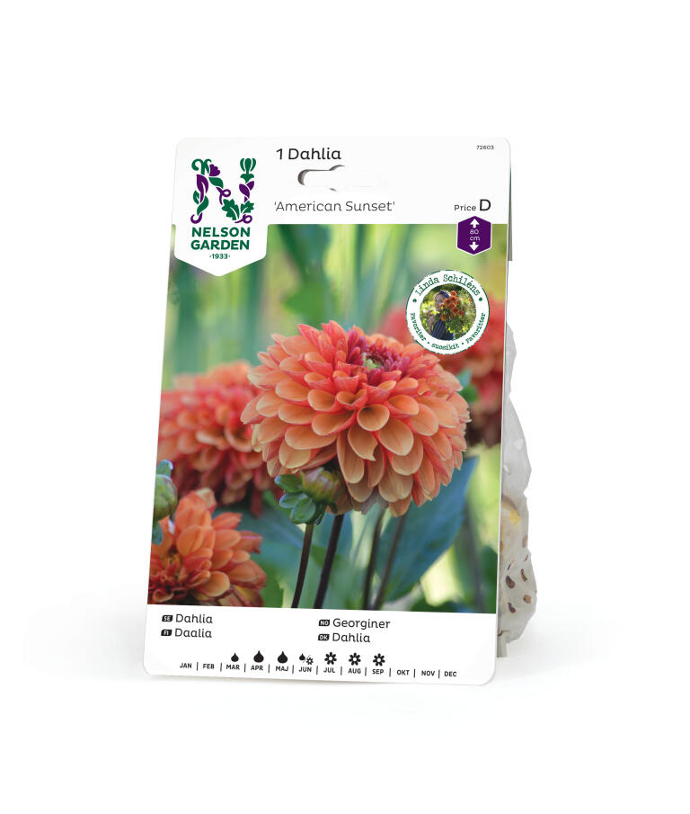 En nätt dahlia där solnedgångens brinnande färger – gult, orange och tegelrött – kombineras på kronbladens fram- och baksidor. Den fyllda blomman påminner om en pompomdahlia och den första följs av många fler.