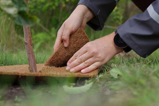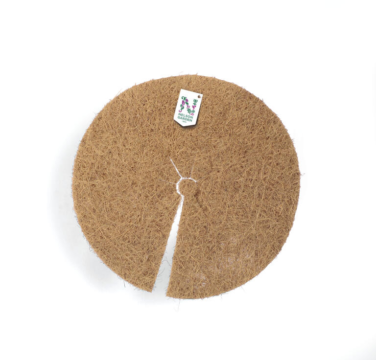 Rund matta av kokosfiber som förhindrar ogräs och bevarar fukten i jorden. Snittet mot hålet i mitten gör den enkel att placera runt träd eller buskar. Kan ev. täckas med bark.
