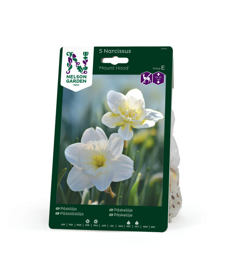 'Mount Hood' är en påsklilja och tillhör Trumpetkroniga Gruppen. Den har stora vackra blommor som börjar blomma i gult och sedan i cremevitt. Passar utmärkt både i rabatten, bland buskar och under träd. Anses vara mindre smaklig för rådjur, hare, kanin och sork.
