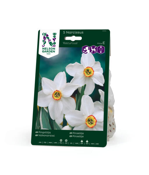 'Recurvus' är en klassisk, doftande pingstlilja. Blommorna har vita relativt smala kalkblad och en liten gul bikrona med röd kant. Sorten blommar relativt sent. Anses vara mindre smaklig för rådjur, hare, kanin och sork.