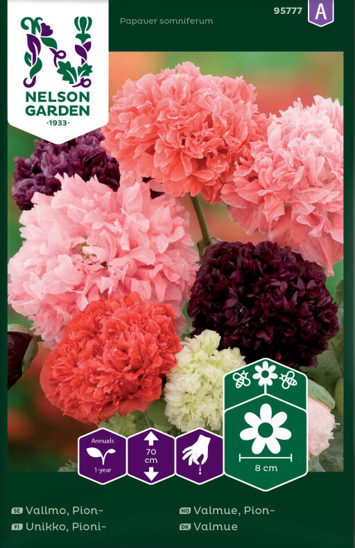 Stora, fyllda, pionliknande blommor. Blandningen innehåller rosa, vita och röda nyanser. Mycket lättodlad rabatt- och snittblomma. Så både höst och vår för att få lång blomningstid. Trivs i de flesta väldränerade jordar.