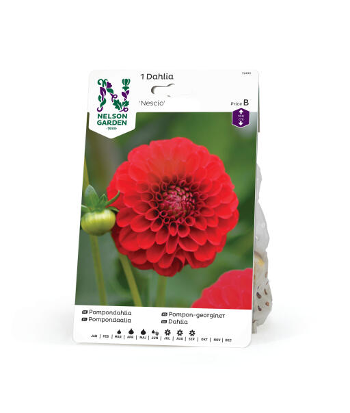 En dahlia med eldröda, tätt fyllda och helt runda blombollar. Underbar i rabatter, gärna flera i grupp.