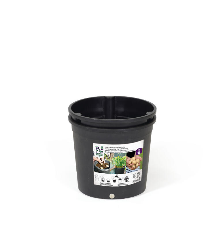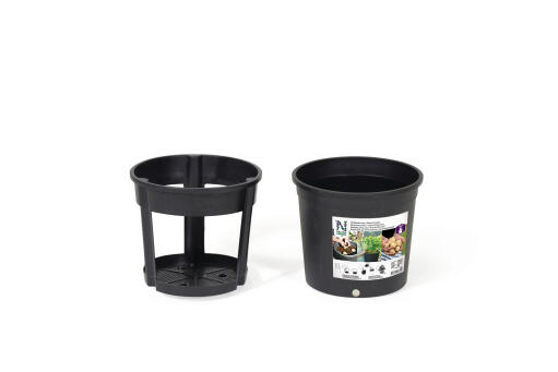 1. Potatiskrukan består av två delar, en innerkruka och en ytterkruka. Placera innerkrukan i ytterkrukan och fyll upp med 1/3 av krukan med gödslad, porös planteringsjord.