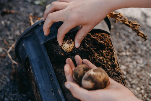 2. Sätt 3–4 certifierade sättpotatis i mitten av krukan och fyll upp med jord.
