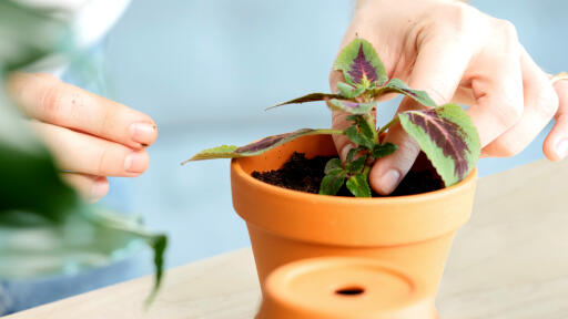 2. Omplantering av sticklingar: fyll upp en kruka med jord och placera sticklingen lika djupt som den stod tidigare, alternativt ca 5-10 cm djupt eller i nivå med första bladparet. Platta till jorden lätt kring stjälken och vattna därefter. Trä gärna en plastpåse över krukan för att skapa ett minidrivhus och ställ på en ljus plats.