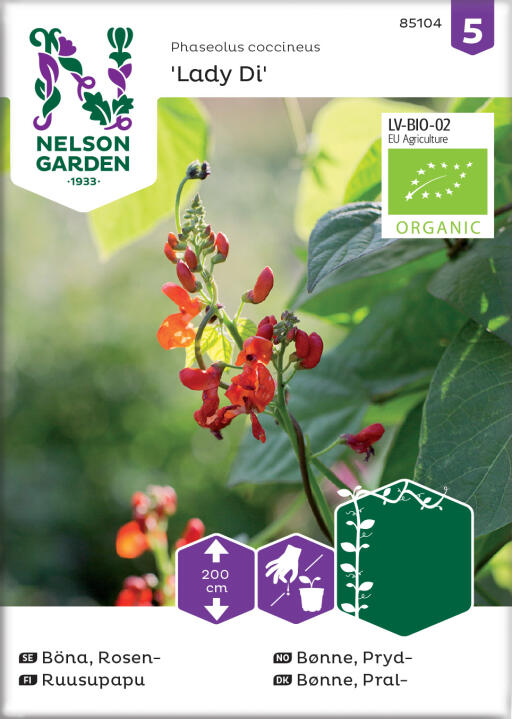 Ekologiskt frö. En motståndskraftig blomsterböna med vackra, röda blommor. Odla gärna vid en spaljé i skyddat läge. Ger riklig skörd av smakfulla gröna baljor som likt skärbönor går att använda kokta.