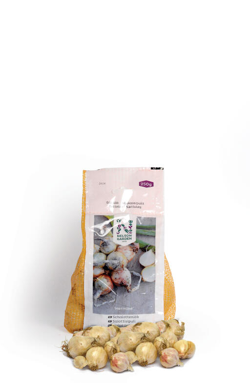 Sättlök. En unik vit schalottenlök från Frankrike. Mycket smakrik. Så mild att den passar rå i sallad, men även god att ugnsrosta och grilla. Varje planterad lök delar sig till ett knippe av ca 5-8 nya lökar.
