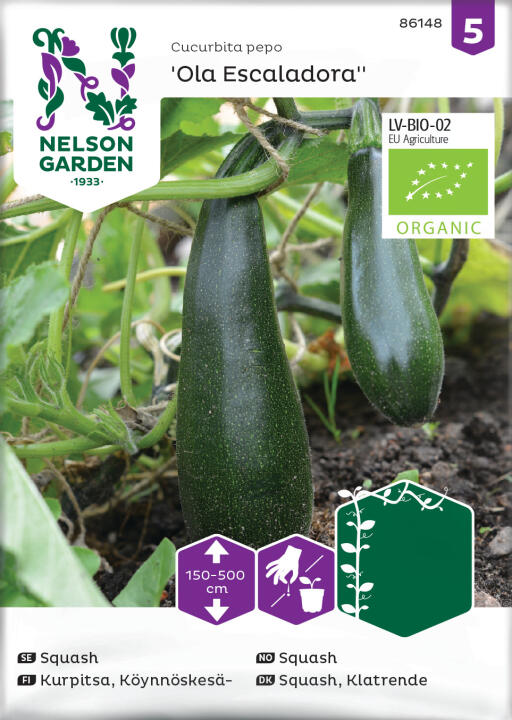 Ekologiskt frö. En klättrande squash som ger riklig skörd av gröna, ca 20cm långa frukter. Skörda regelbundet. Behöver stöd. Toppa ev. sidoskotten.