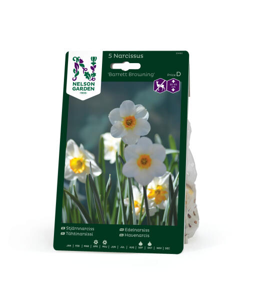 'Barrett Browning' är en stjärnnarciss som tillhör Småkroniga Gruppen. Denna sort har vita kalkblad och en bikrona, som är kraftigt orange. Anses vara mindre smaklig för rådjur, hare, kanin och sork.