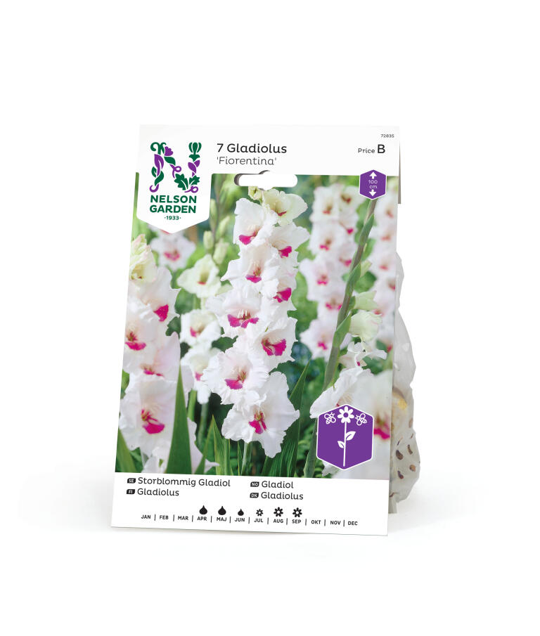 Storblommig gladiol med rent vita blommor med kontrasterande röd fläck i svalget. Lämplig i rabatter, gärna flera i grupp. Även i stora krukor och framförallt fantastisk i maffiga buketter.