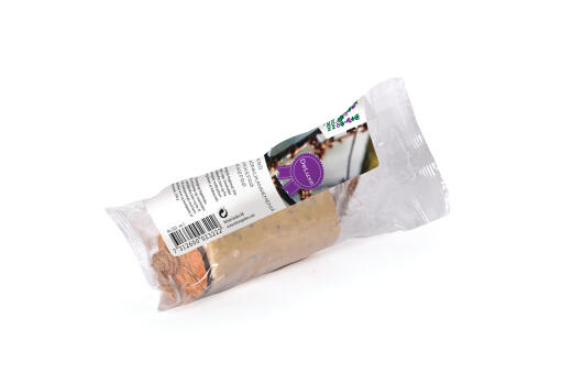 Energirik fågelmat, klar att hänga upp. Innehåller talg, jordnötter och mjölmask. En 100 % naturprodukt med komposterbart snöre och bottenplatta från kokosnöt.