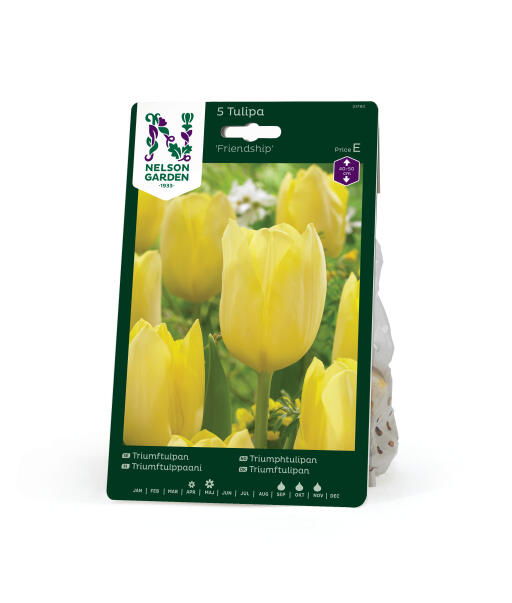 En välformad och svalt gul Triumftulpan som har tulpantypens självklara egenskaper: en stabil stjälk och en blomma som håller länge. Det gör detta till en utmärkt snittblomma. Den gula färgen smälter lätt in i olika färgkombinationer.