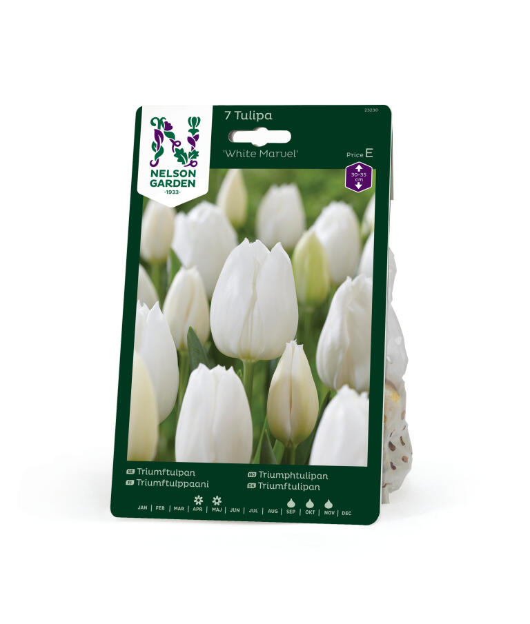 'White Marvel' är en stramt elegant tulpan med krämvita blommor på styva, stadiga stjälkar. Blommorna brukar stå länge. Mycket bra som snittblommor.