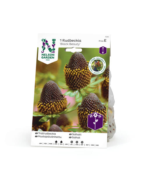 Denna mycket speciella rudbeckia har frodiga gröngrå blad, och är unik i sitt slag med stora, purpursvarta, koniska blomknappar omgivna av endast gröna foderblad och saknar helt kantblommor. Passar utmärkt i rabatten. Mycket dekorativ till snitt.