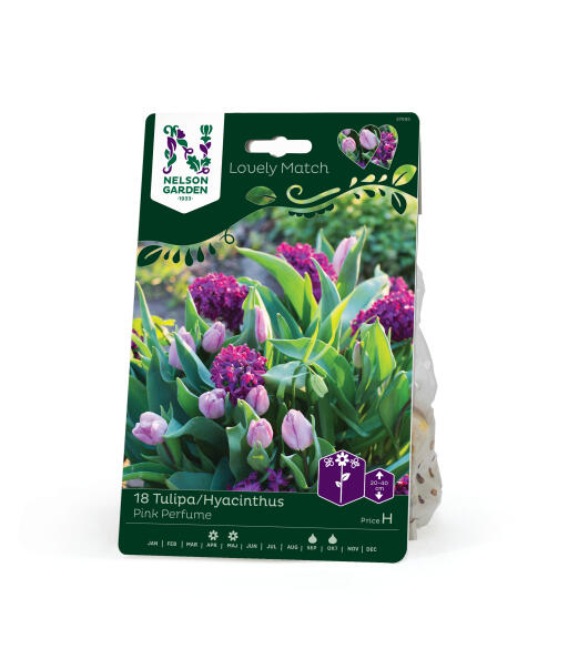 En underbar bukett av mörkt purpurröda, doftande hyacinter och ljuvliga ljuslila tulpaner vars svaga silverskimmer förhöjer anrättningen. En liten läckerhet för krukan vid entrén men också en nätt godbit i rabatten.
