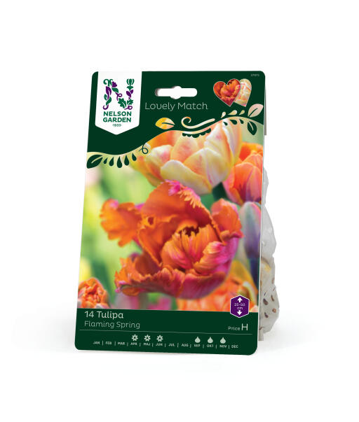 En flammande tulpanbukett i gult, orange och rött. Ett harmoniskt färgspel med lång blomningstid där varje sort skiftar nyans från knopp till utslagen blomma och även slår ut vid lite olika tidpunkter. Vackra i kruka och fina till snitt.