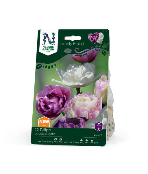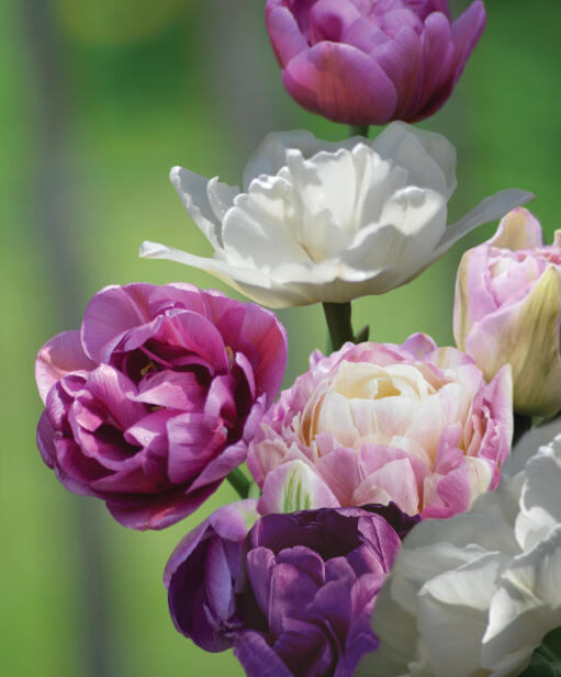 Vackert fyllda tulpaner i vitaste vitt, ljuvt rosa och läckert rödlila. Romantisk färgskala, mild doft och lager på lager av blomblad gör denna kombination till något alldeles extra. Även utmärkt till snitt, inte kan man motstå en sådan bukett!