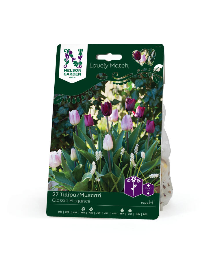 En välavvägd färgkombination från dovt vinrött, över lilarosa toner till vitaste vitt. Tulpanernas klassiska blomform framhävs fint av pärlhyacintens druvklasar av kritvita blommor. En stilren kombination för rabatt och kruka.